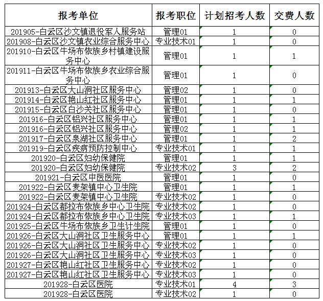截止2019年8月19日16:00,報名人數(shù)(以繳費人數(shù)為準(zhǔn))與崗位招聘計劃數(shù)達不到3:1比例的崗位如下: