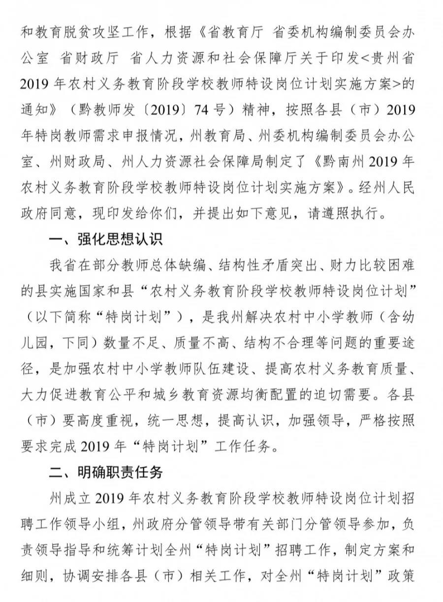 為進一步加強我州農(nóng)村教師隊伍建設(shè),充實農(nóng)村學(xué)校師資力量,提升農(nóng)村教育質(zhì)量,根據(jù)《省教育廳省委機構(gòu)編制委員會辦公室省財政廳省人力資源和社會保障廳關(guān)于印發(fā)<貴州省2019年農(nóng)村義務(wù)教育階段學(xué)校教師特設(shè)崗位計劃實施方案>的通知》(黔教師發(fā)〔2019〕74號)精神,結(jié)合我州實際,制定本方案。