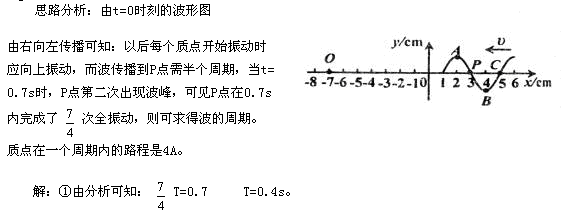 例題2、一列簡諧橫波,在t=0時波形如圖7—8所示,P、Q兩點的坐標(biāo)分別為-1m、-7m,波的傳播方向由右向左,已知t=0.7s時,P點第二次出現(xiàn)波峰,則:①此波的周期是多少?②此波的波長是多少?③當(dāng)t=1.2s時P點的位移?④從t=0到t=1.2s質(zhì)點P的路程是多少?