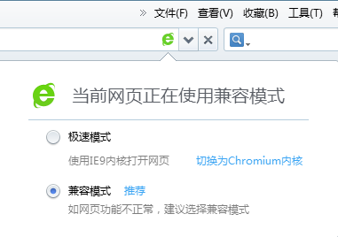 點(diǎn)擊地址欄的內(nèi)核切換按鈕,可以手動(dòng)切換瀏覽模式,如兼容模式切換為極速模式: