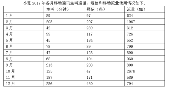 92、小張2017年主叫通話、短信和移動流量均使用了套餐外服務的月份有幾個?